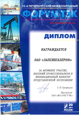 По итогам 10-го Петербургского Международного Форума ТЭК холдинг награжден дипломом за активное участие, высокий профессионализм и инновационный характер представленной экспозиции.