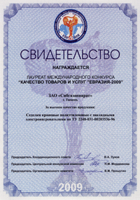 Подведены итоги Международного конкурса «Качество товаров и услуг» «Евразия-2009». Финалисту проекта ЗАО «Сибгазаппарат» присвоено звание Лауреата.